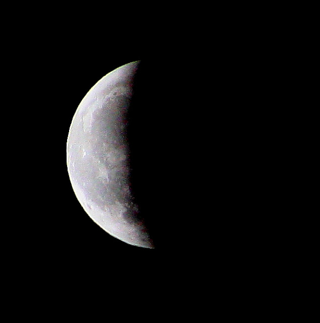 My niece had sent me a message asking if I would be watching the lunar eclipse last night. It would occur late in the night here and I had checked the sky when the dog and I did our nightly constitutional - high hazy cloud cover. I woke up around 3 a.m. to a heavy low rumble: either far off thunder, the railroad company was moving around train cars on a siding four miles distant, or my 'head explosions' were acting up again. One of the motion detector lights was on so I looked out the window. Nothing on the ground - probably a passing rabbit. However, I could clearly see stars overhead. I'd check on the eclipse progress. Past prime but there it was - the full moon w/ a big chunk missing. Decided to see if I could get a picture. Out on the deck sans shoes (but I did put on a bathrobe) I monkeyed w/ my tripod and camera. Kinda eerie in the dark when I heard the owls start calling to each other and then a long protracted coyote howl. Whip, though, was sitting attentively at the edge of the deck watching over the meadow. Not sure what she would do if something threatening came lumbering out of the woods but still comforting to know she had my back.